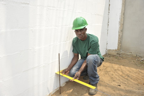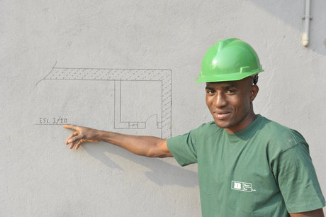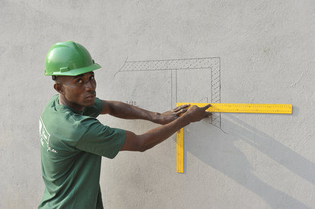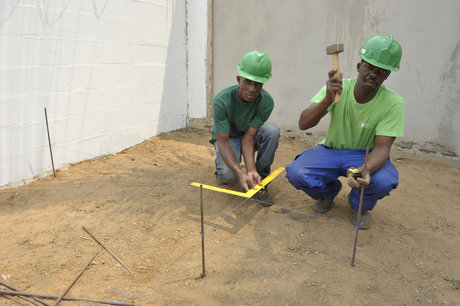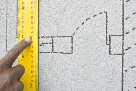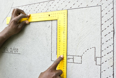 Die Bauzeichnung wurde im Maßstab von 1:10 gezeichnet, d.h. 1 cm in der Zeichnung sind 10cm beim Bauen. Mit einem Metermass nehmen wir die Maße für den Grundriss ab. Anschliessend übertragen wir im Maßstab 1:10 diese Maße dann mit Pflöcken auf das Bauland. Den Verlauf der Mauer kennzeichnen wir Schnüren.