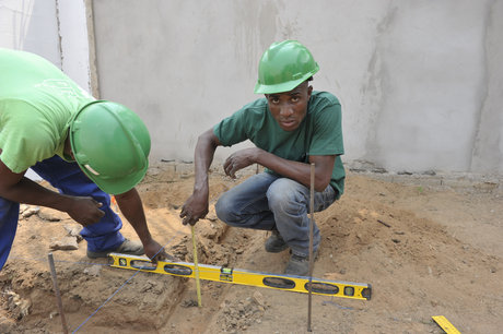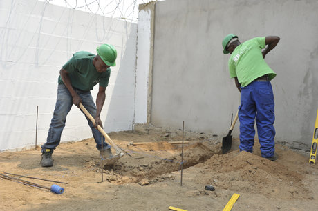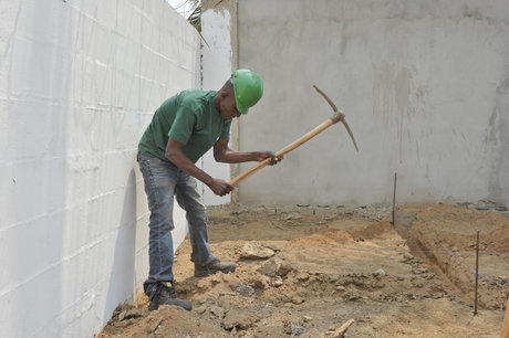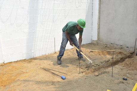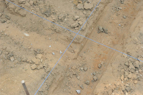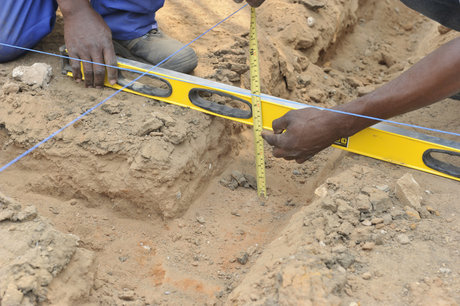 Nachdem die Maße von der Zeichnung auf den Grundriss übertragen wurden, beginnen wir mit der Ausschachtung des Fundaments.